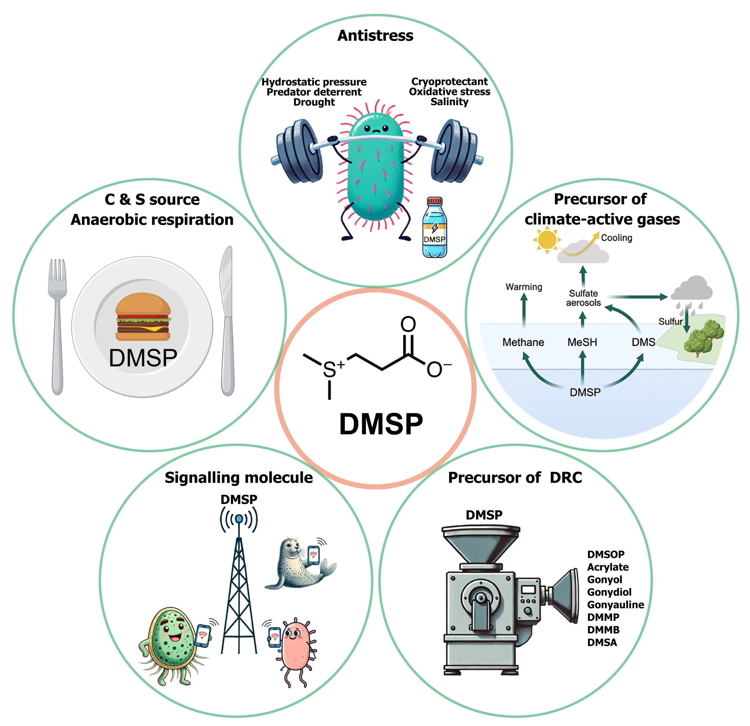 Dimethylsulfoniopropionate (DMSP) is one of Earth’s most abundant organosulfur compounds, vital to global sulfur cycling and, potentially, in climate regulation. It is a major marine nutrient, antistress and signalling molecule and the precursor of the climate-active gases dimethylsulfide (DMS), methanethiol (MeSH) and methane.